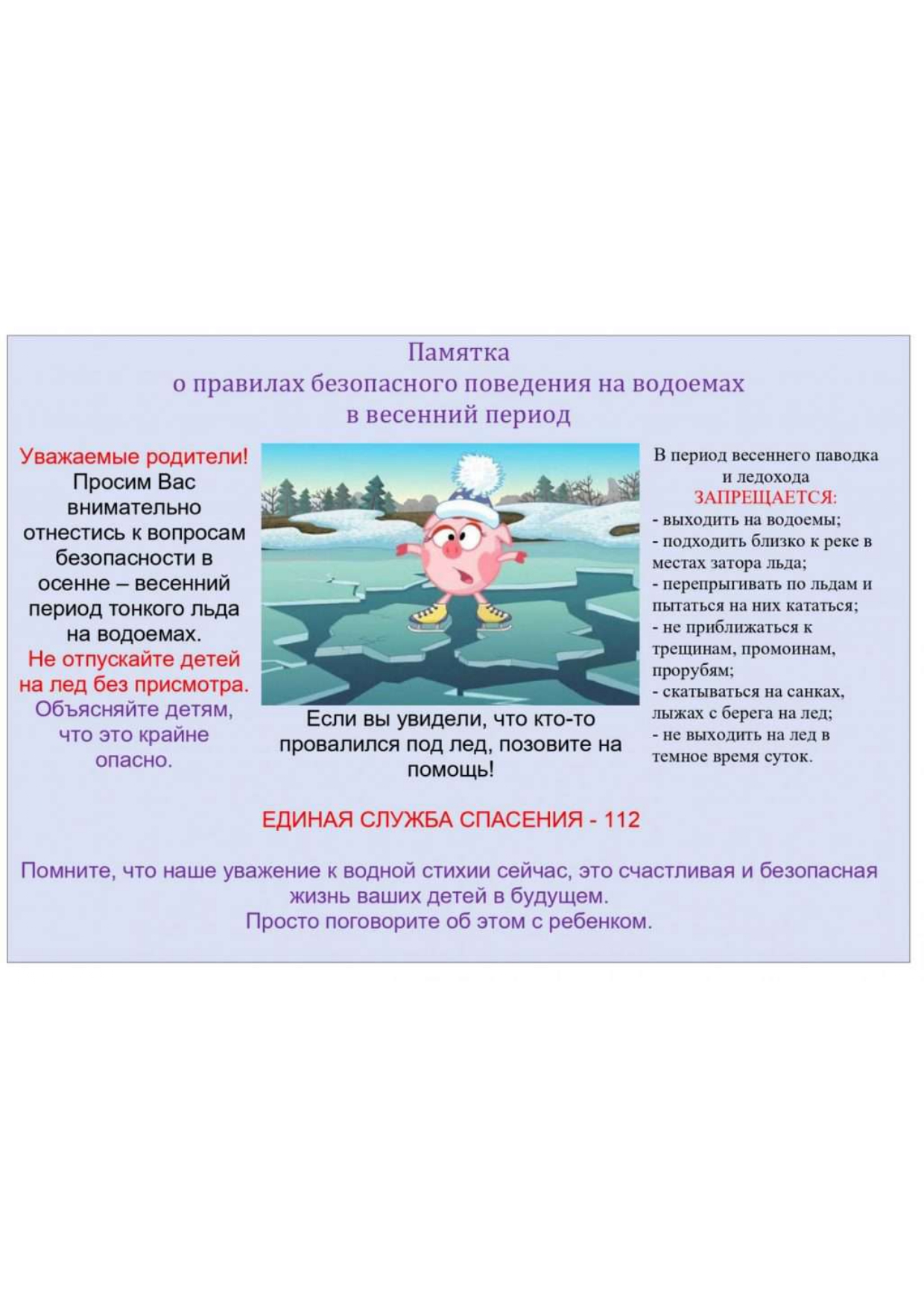 ледохода; предупредите их об опасности нахождения на льду при вскрытии