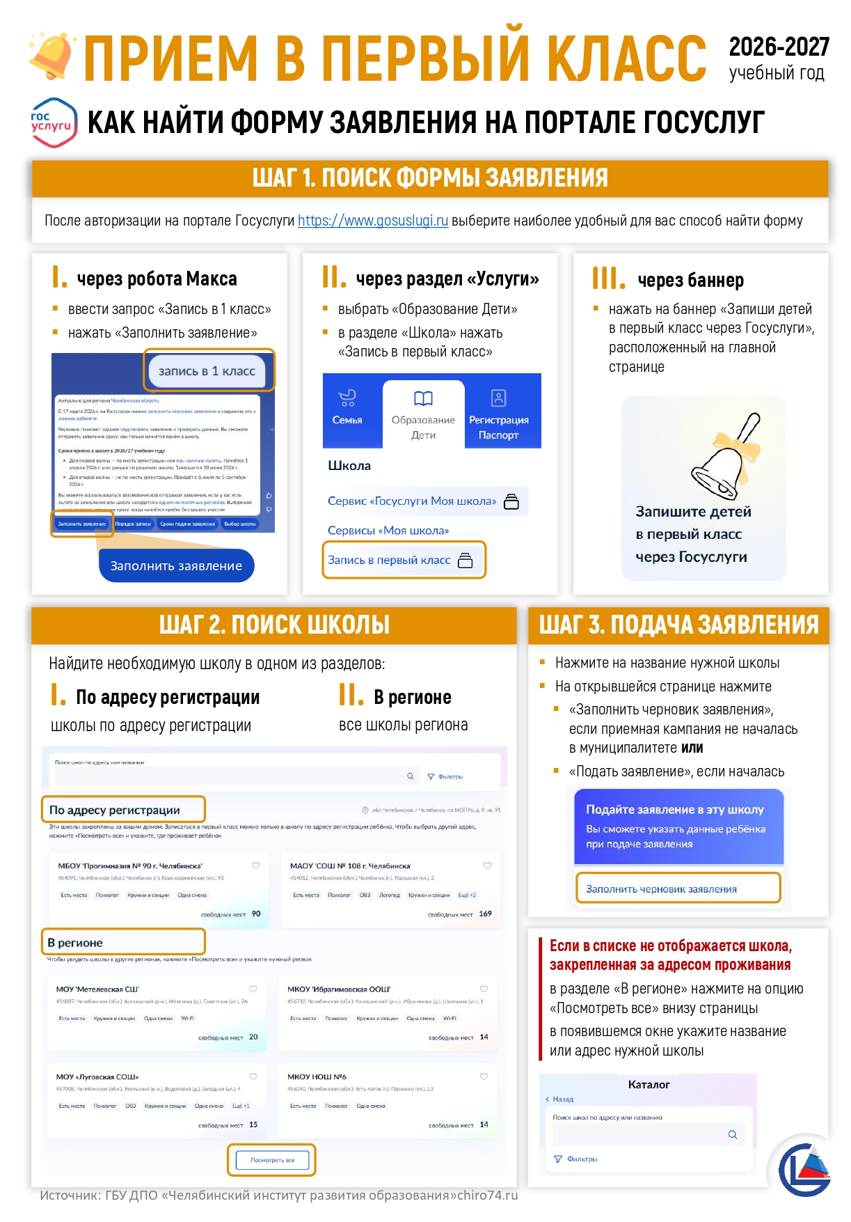 - с использованием функционала (сервисов) региональных порталов государственных и информационных систем субъектов Российской Федерации интегрированных с ЕПГУ https://edu-74.ru/ и https://gosuslugi74.ru/ ;